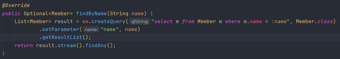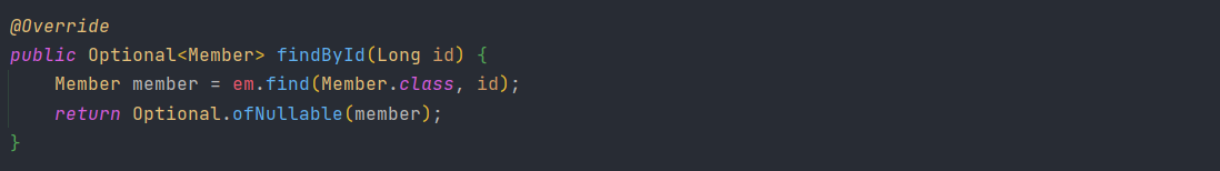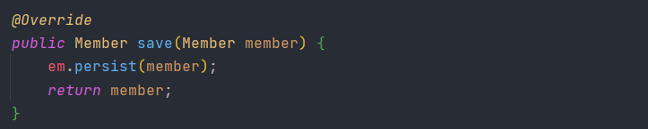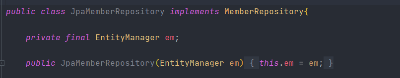 @RequiredArgsConstructor 어노테이션을 사용했기 때문에 final 붙은 필드인 em에 entity manager를 주입해준다.